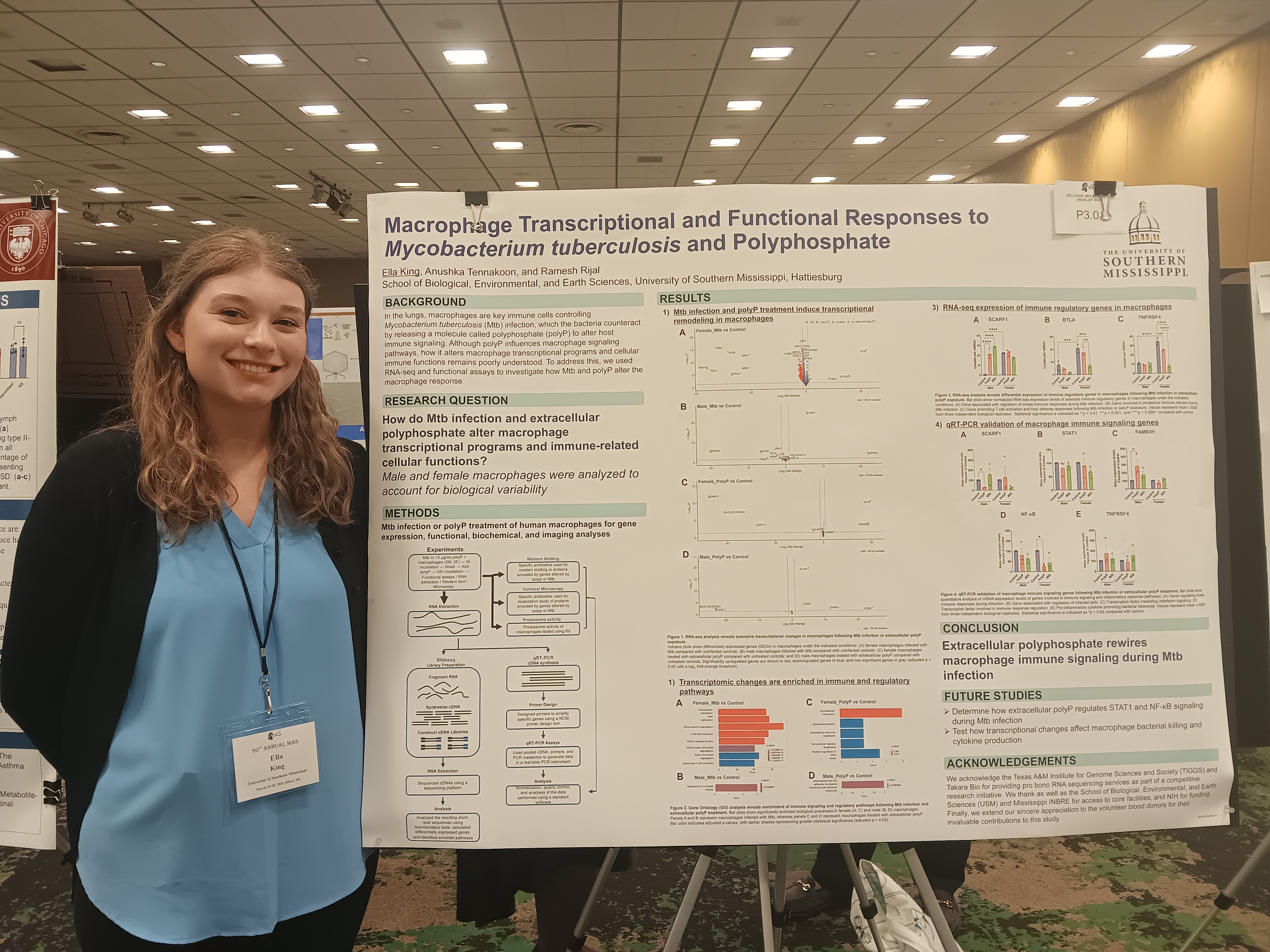 Congratulations to Ella King on receiving an Eagle SPUR (Scholars Program for Undergraduate Research) award through the Drapeau Center for Undergraduate Research at the University of Southern Mississippi. The award supports her undergraduate research in the Rijal Lab focused on macrophage responses to Mycobacterium tuberculosis. Well done, Ella.